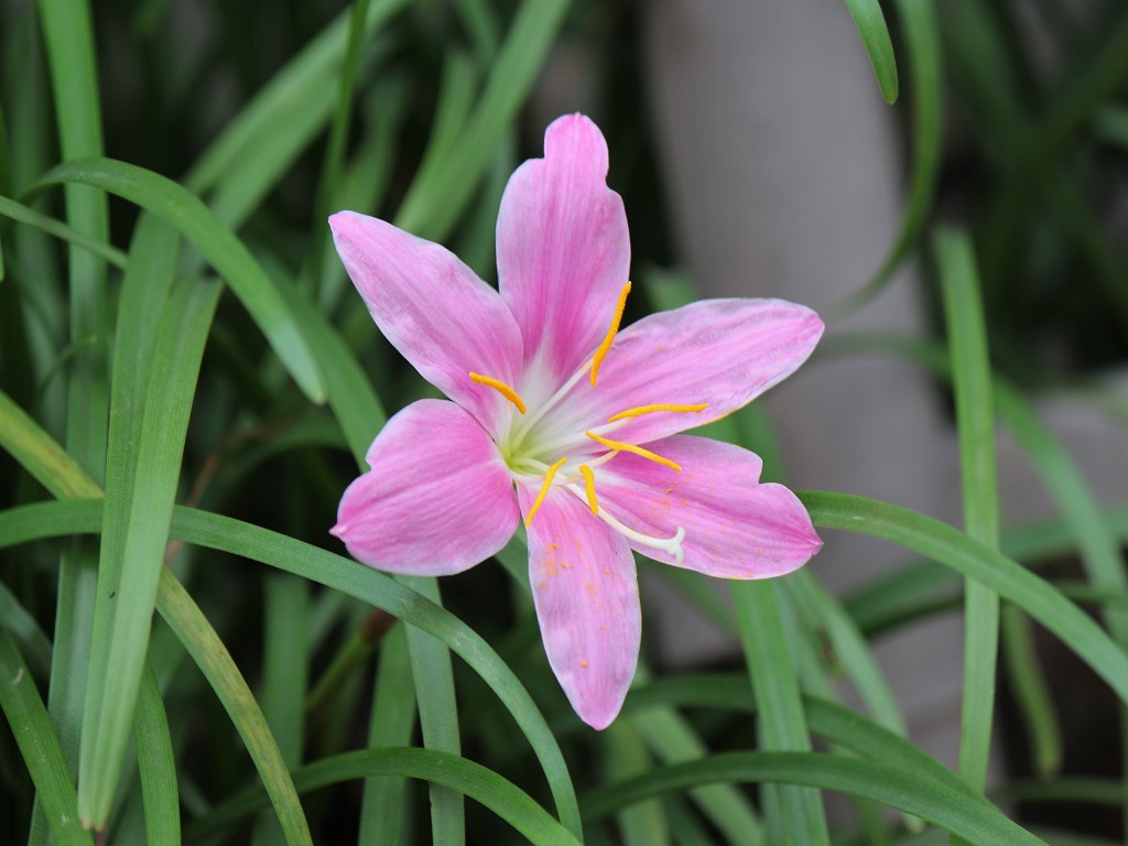 道脇の塀際に植えられたハブランサス。