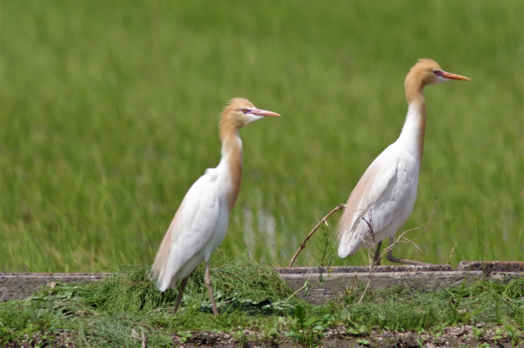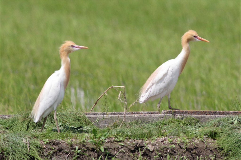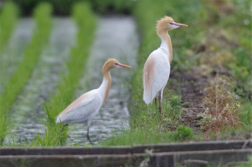 遠くの田の畔に二羽の白い鳥が見えた。
