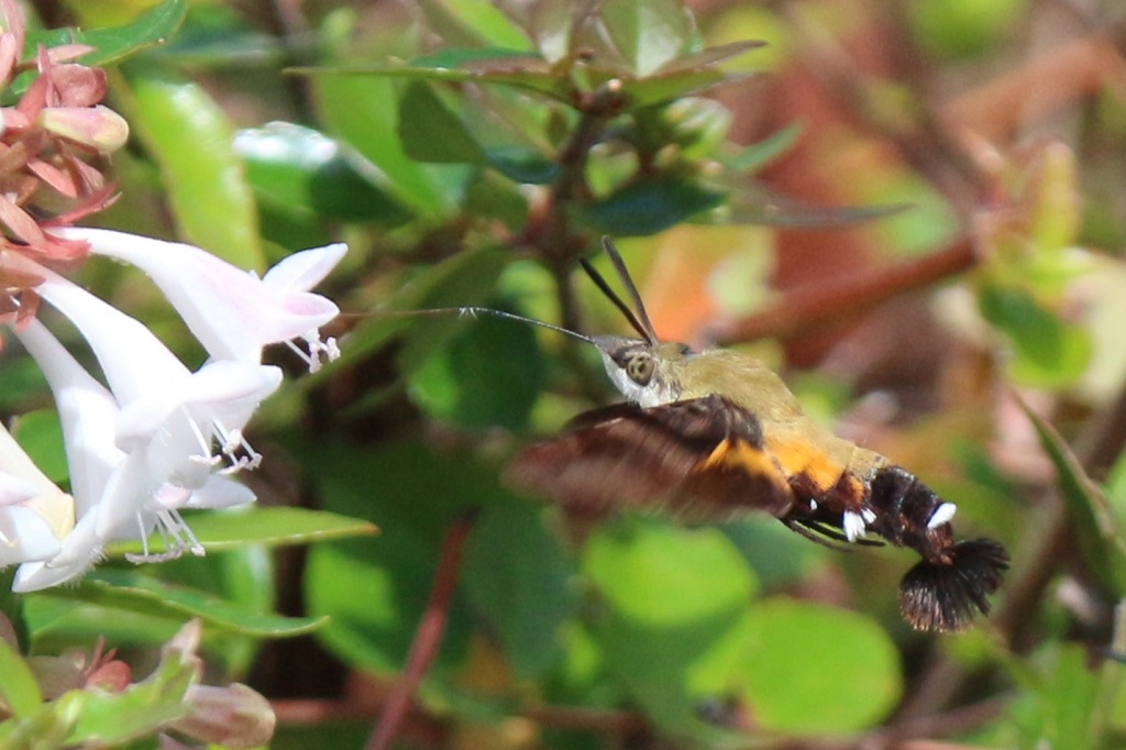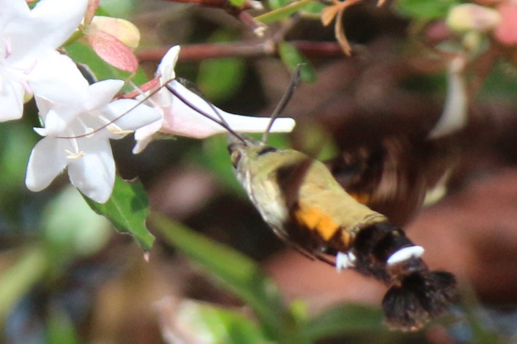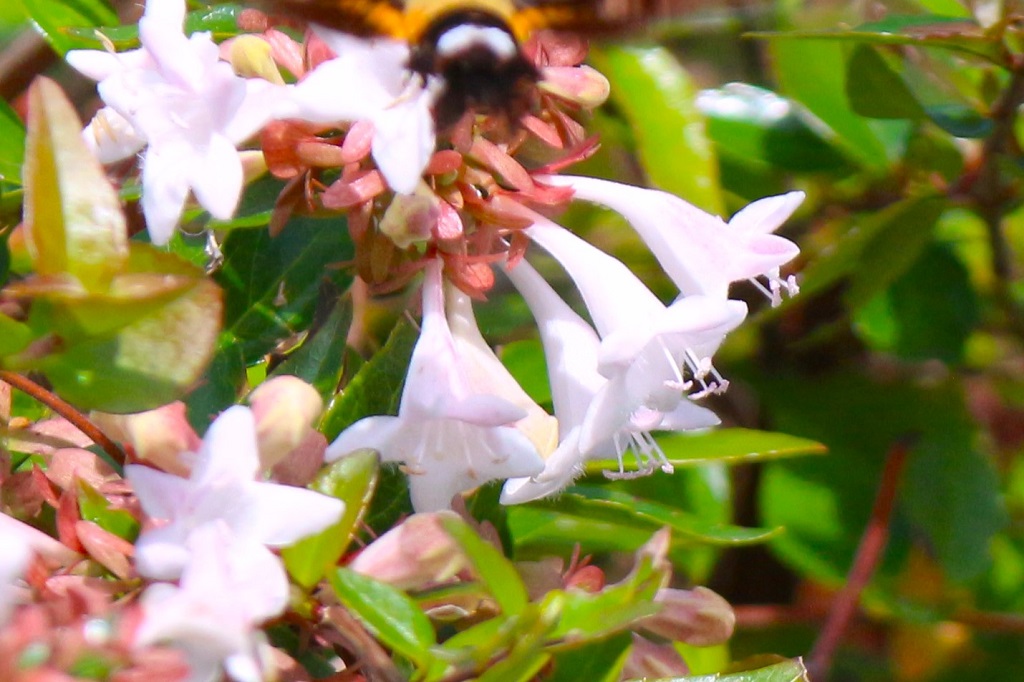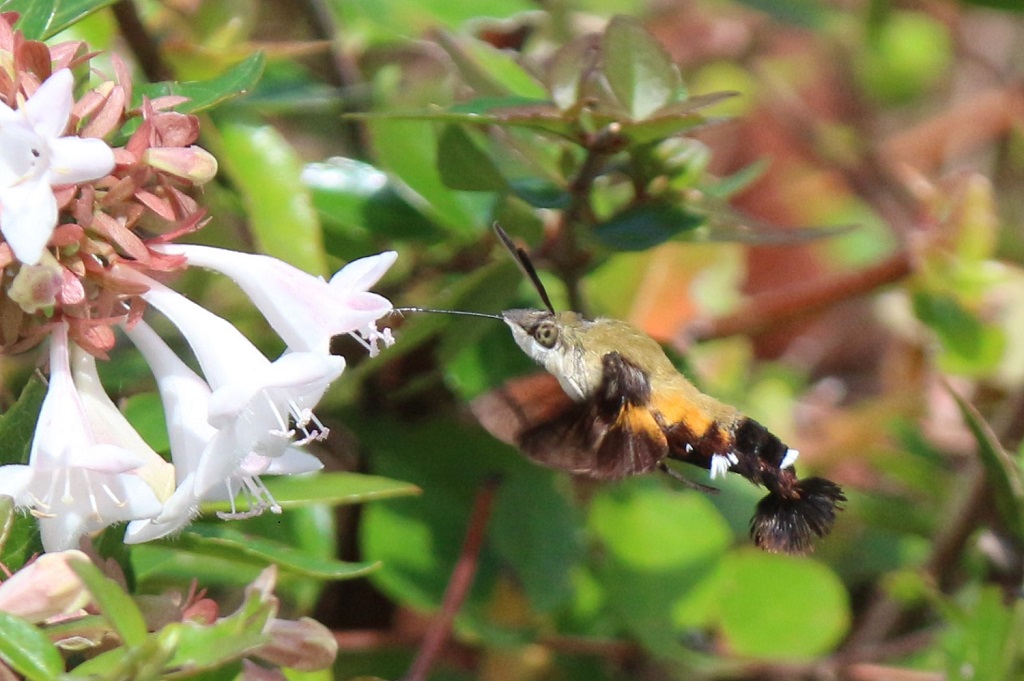 ラッパ状のアベリアの花に、ホバリングをしながら吸蜜管を差し込んでいる。