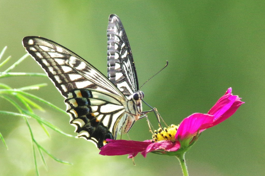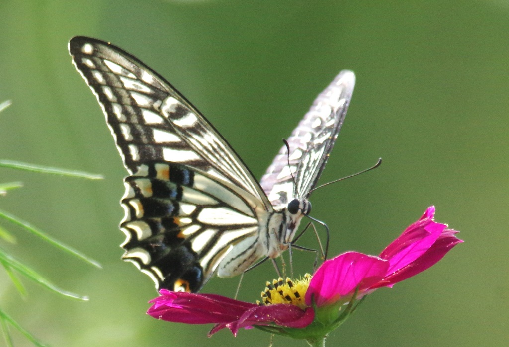ナミアゲハがコスモスの花で吸蜜している。