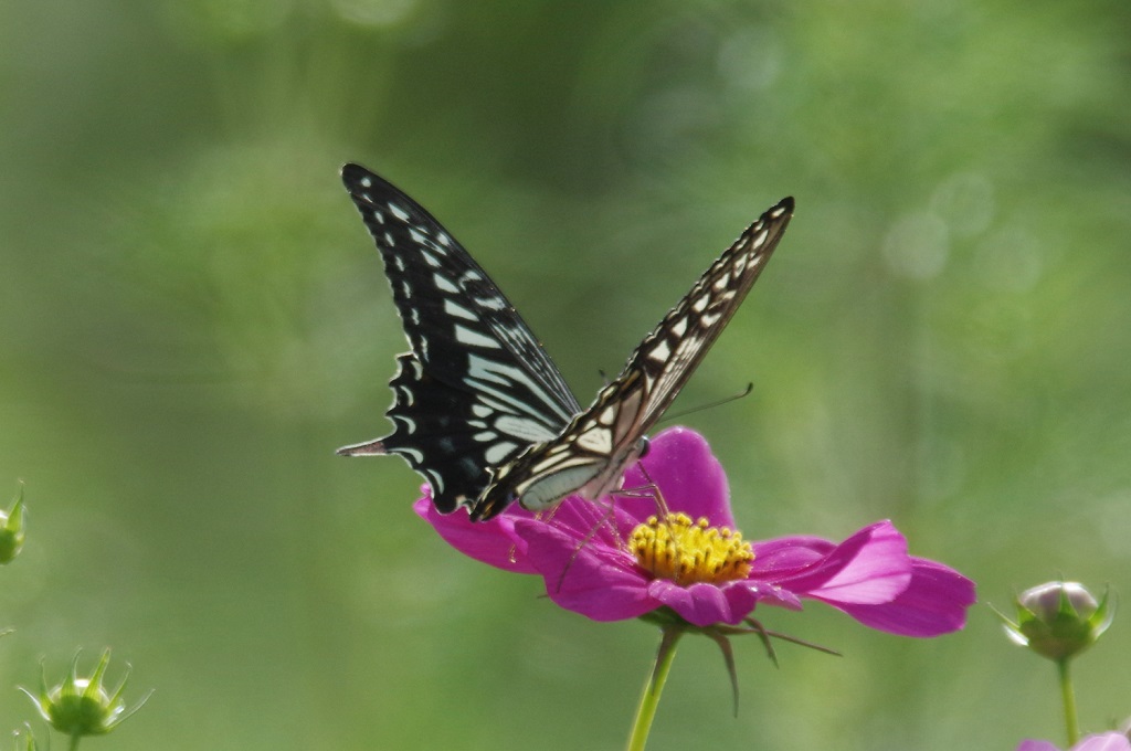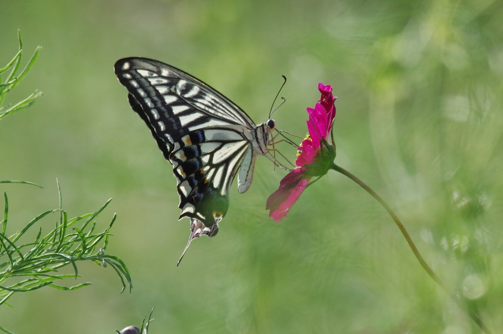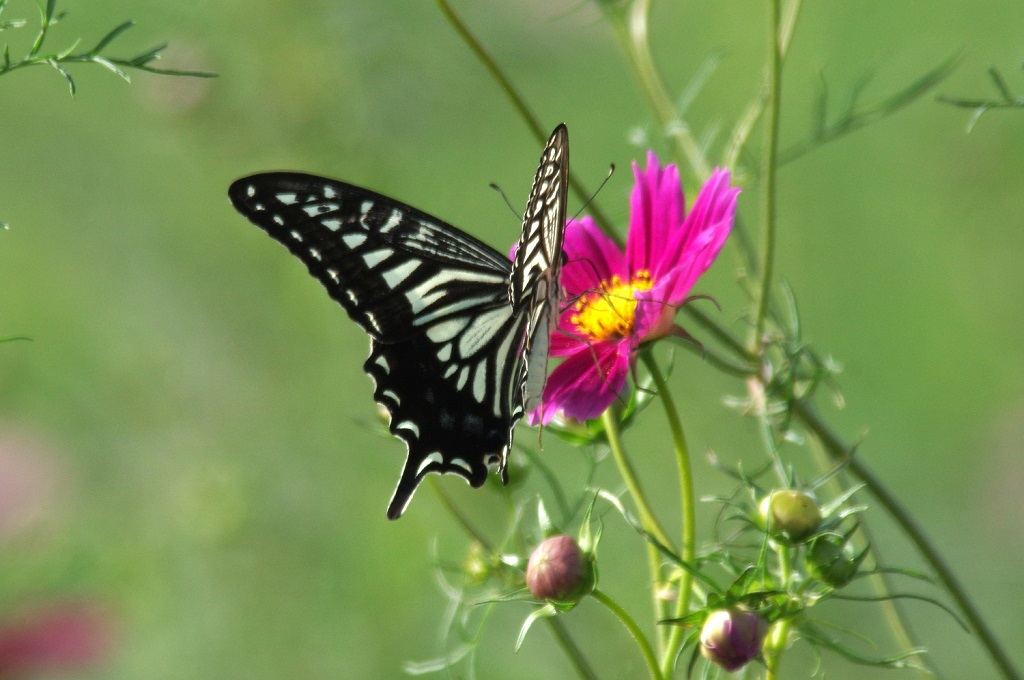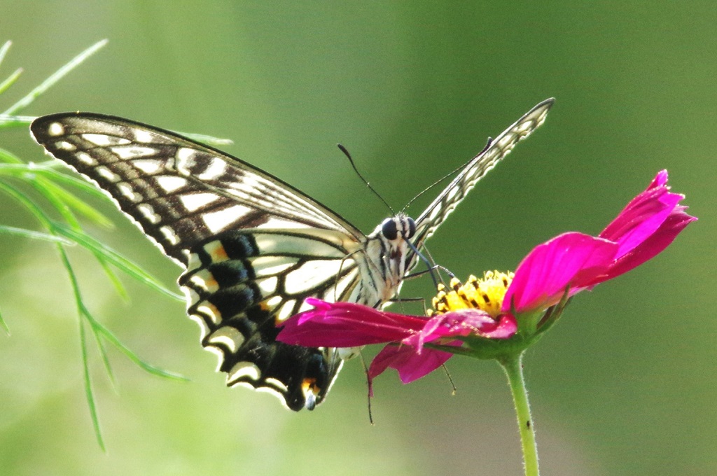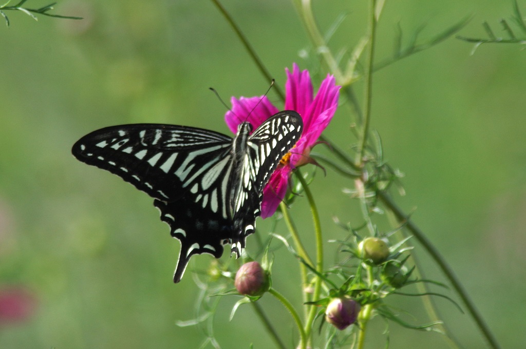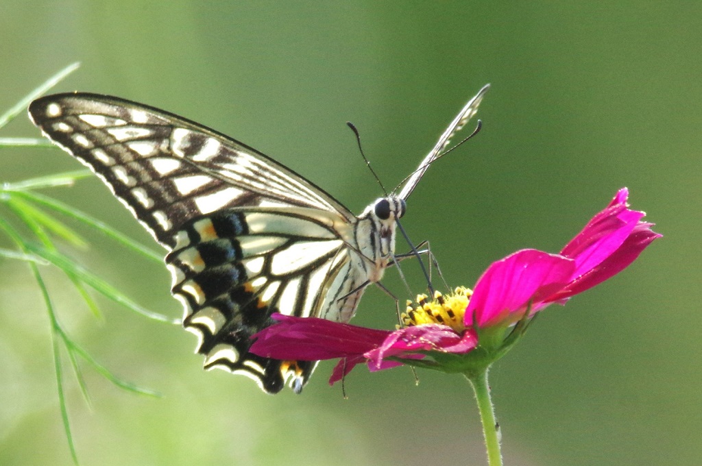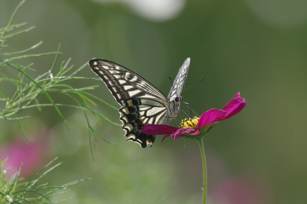 コスモスにナミアゲハが来て、花に留まってはまた別の花へと移動していた。