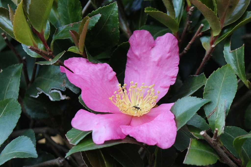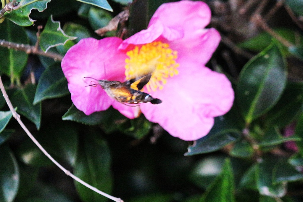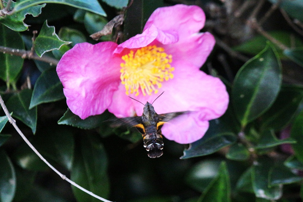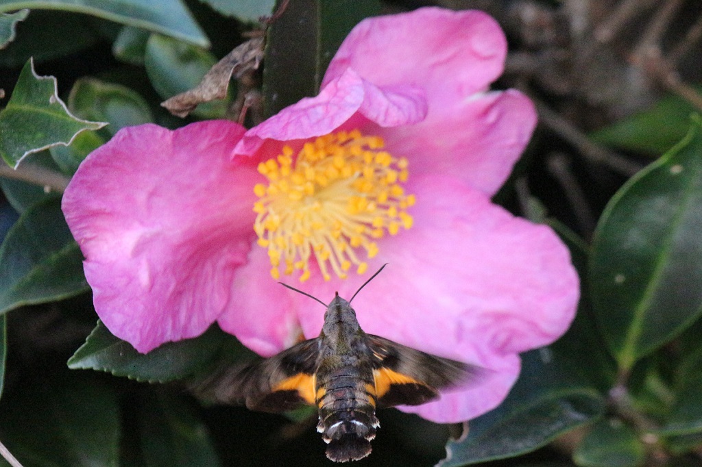 今日の出会い 山茶花にホシホウジャク