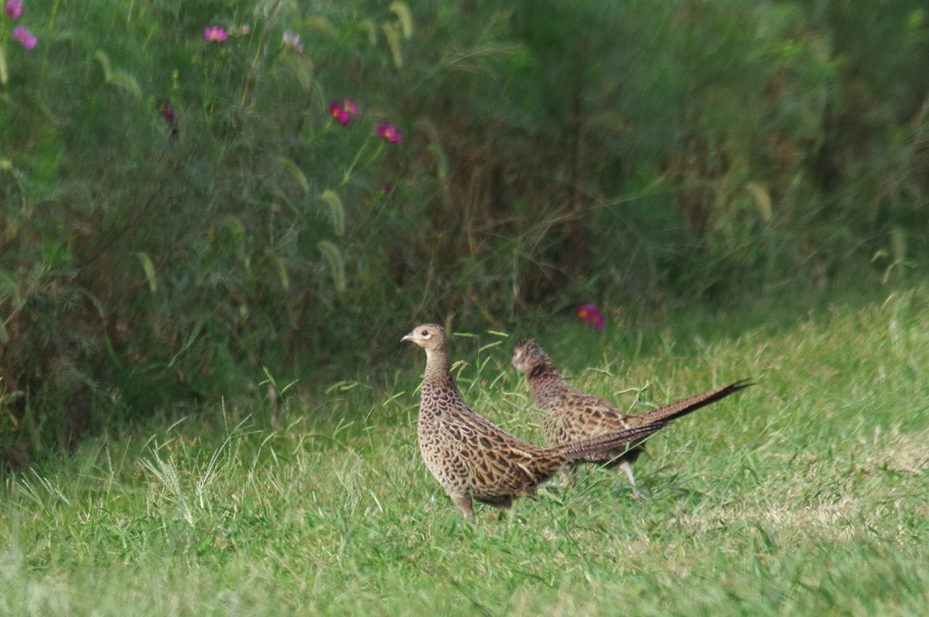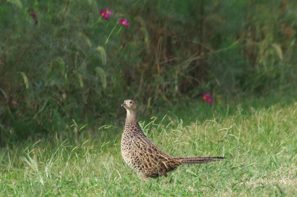 コスモス畑でノビタキを待って居たら、網目模様のキジのメスが出て来た。