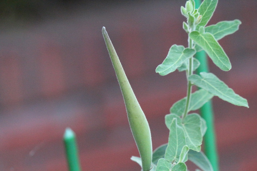 7月頃には10cmくらいの、尖った鞘(さや)の実が成った。